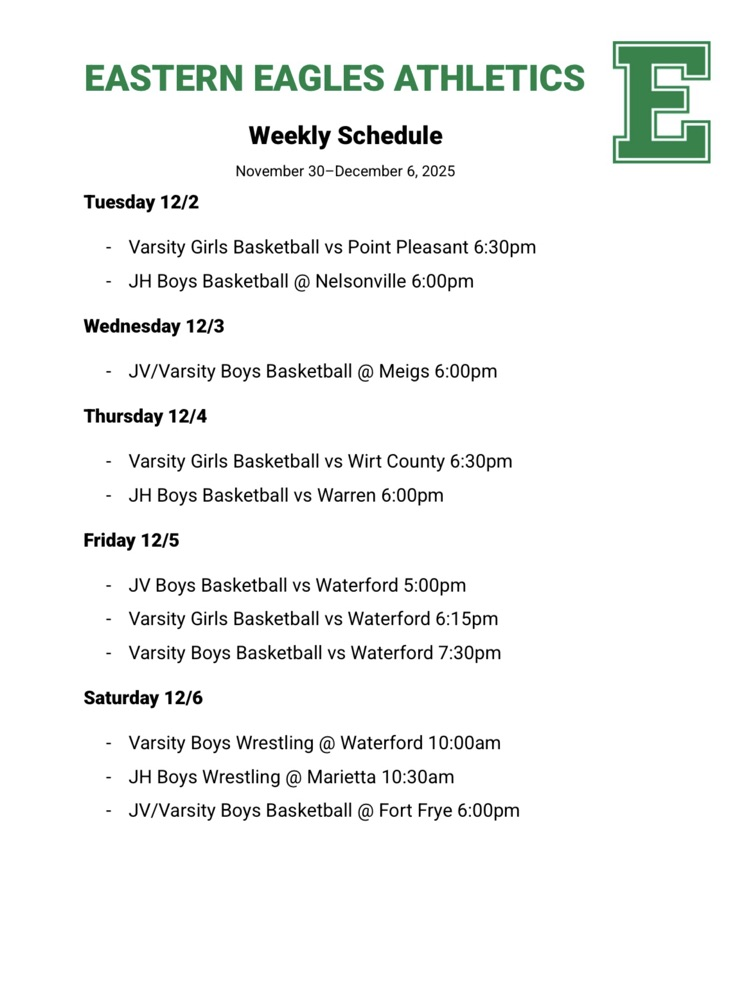 Eastern Youth Basketball League Saturday Game Schedule Begins December 6th (This schedule will be used every Saturday through January) ⸻ Arrival & Team Assignments • Players should arrive in the Elementary Cafeteria at least 20 minutes before their game. • Team assignments and court locations will be posted by the admission table each week. • Teammates and opponents change weekly. ⸻ Admission • Players & Students: Free • Adults: $5 Concessions available each week! ⸻ Jerseys & Uniforms • Players who have not yet received a jersey will receive it before their first game Saturday. • Please wear black shorts with your jersey. ⸻ Attendance • If your player cannot attend, please let us know in the app as early as possible so teams can be adjusted. ⸻ Volunteers Needed We are looking for help with: • Officiating • Admissions • Scorekeeping If you’re willing to help, please fill out the form in the app. ⸻ Questions? Please reach out anytime—thank you for supporting Eastern Youth Basketball! Game Schedule https://docs.google.com/document/d/1gUV3xMJ-QNePUMCLKUiVZ0ljZ5IfDw518kLlUI2IwPs/edit?usp=drivesdk Volunteer Form https://forms.gle/Gu1xbjXysRahCQar8